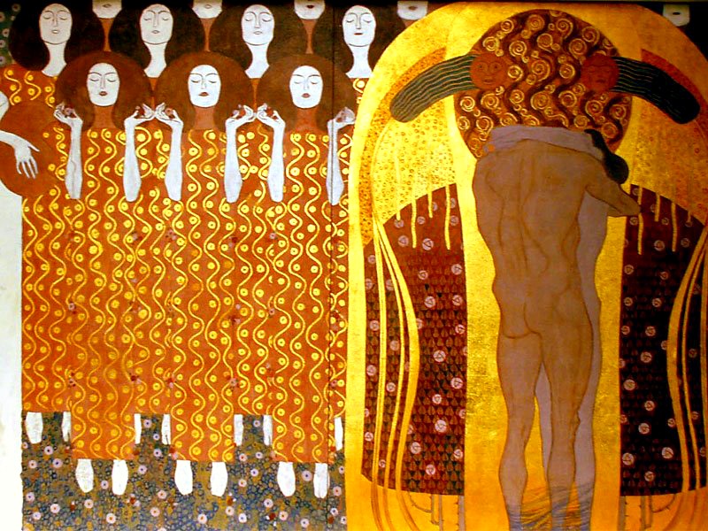 Y en la tercera pared vuelve la luz, emerge una música emotiva … el Arte representado por una figura de inspiración helénica y recurrente en Klimt, que refulge en oro con una bellísima decoración, los apliques del vestido son gemas que reflejan la luz: es la salvación de la humanidad a través del Arte. La Sinfonía de Beethoven recobra el pulso, gentile, y la grandiosidad, allegro vibrante, con brio. Se regeneran las conciencias, las genii reaparecen en disposición vertical, transmiten plenitud, parece que danzan y la música se alza en un crescendo heroico, colossale, con un coro que es pura armonía y expresa una intensa plenitud que nos conduce, al igual que en la 9ª sinfonía, a la «Oda a la Alegría» de Schiller: «este beso al mundo entero» y Klimt se desborda, con su decoración floral, con el abrazo final dentro de la campana que simboliza el Edén, bellísima, despampanante, con el sol y la luna a cada lado. El agua, en forma de oro, fluye alrededor de la pareja, uniéndolos, fusionándolos. No vemos sus rostros, no es necesario, su amor es universal, fruto de la superación de los anhelos reflejados en todo el friso. Siguen los versos de Schiller: «las artes nos llevan al reino de lo ideal, el único donde podemos encontrar pura alegría, pura felicidad, puro amor». ¿Recuerdan el Himno a la Alegría? Yo también lo estoy escuchando en mi interior.